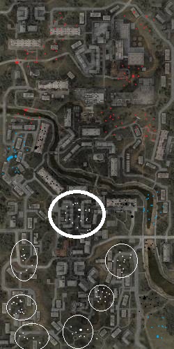 Выделенный белый круг - гл.база ЧН. Объекты, обведенные белыми кругами - блокпосты ЧН. Чёрные точки - бандиты Синие точки - наёмники Белые точки - "Чистое небо" Красные точки - "Монолит"